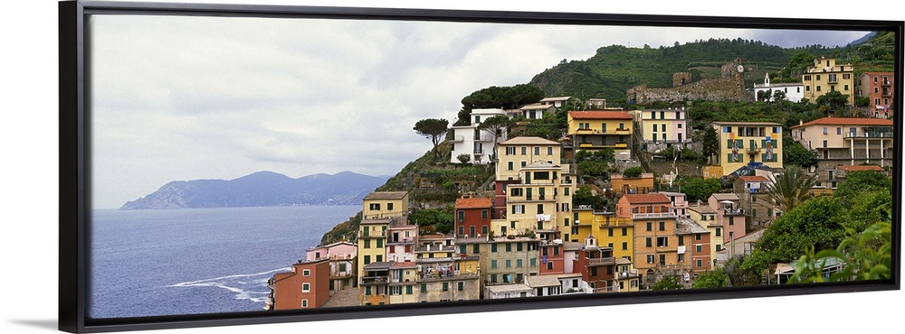 <p>This panoramic landscape photograph of homes built into the hillside overlooking the sea.</p>