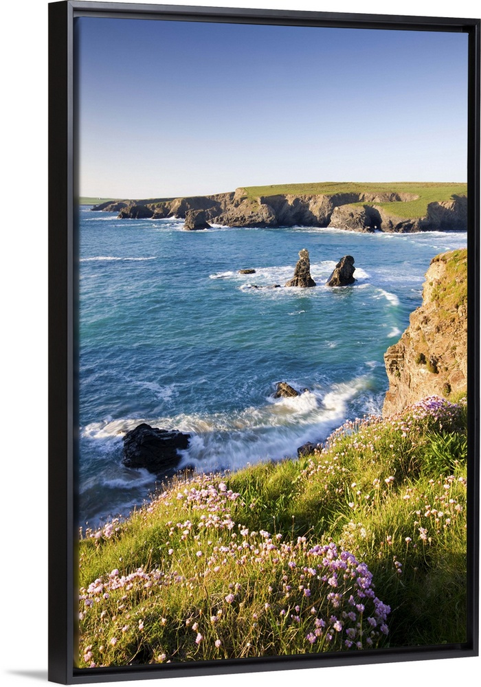 <p>Clifftop view of Porthcothan Bay with Spring wildflowers, Cornwall, England. Spring</p>