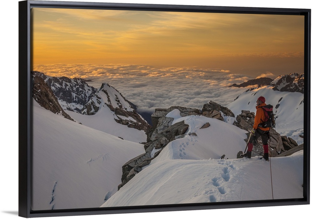 <p>Climber near Pioneer Hut with Douglas Peak and Fox Glacier, Westland Tai Poutini National Park, New Zealand.</p>
