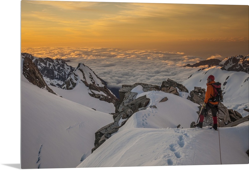 <p>Climber near Pioneer Hut with Douglas Peak and Fox Glacier, Westland Tai Poutini National Park, New Zealand.</p>