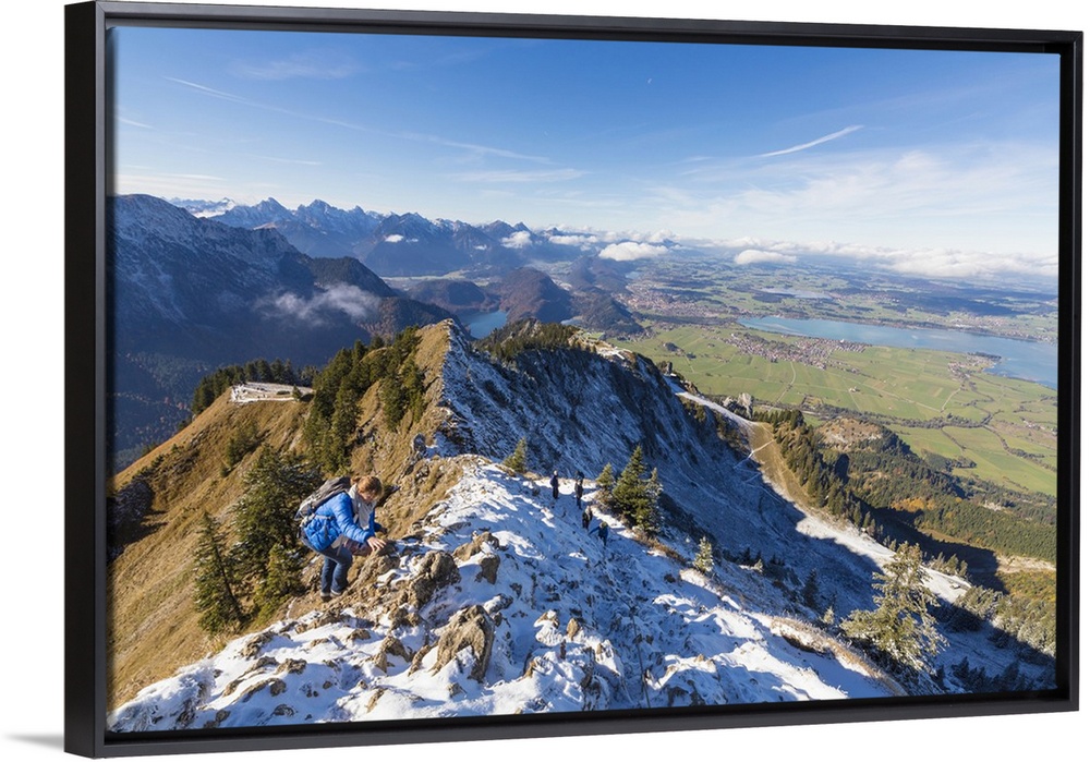 <p>Climbers on steep crest covered with snow in the Ammergau Alps, Tegelberg, Fussen, Bavaria, Germany</p>