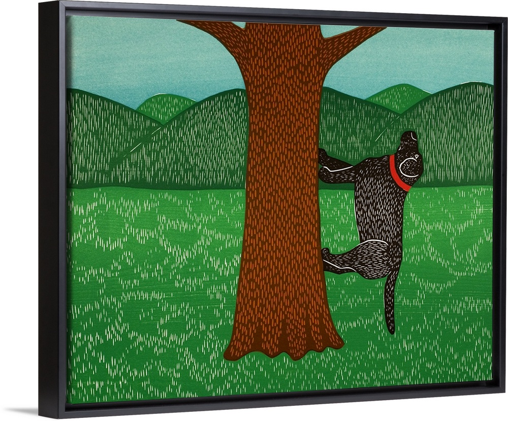 <p>Illustration of a black lab climbing up a tree (most likely chasing a squirrel or bird).</p>