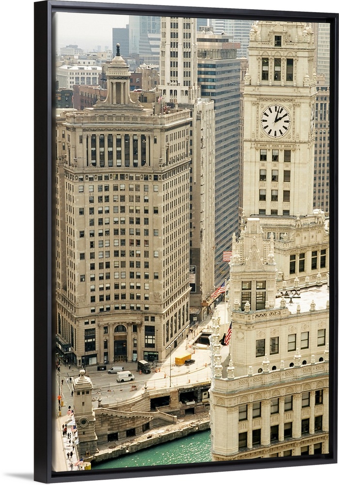 <p>Big photograph includes an aerial view showing a variety of tall skyscrapers lining the waterway of a busy city within the Midwestern United States. The cars and people below can be seen making their way through the city.</p>