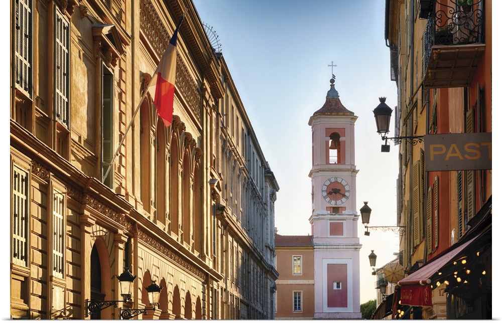 <p>Low angle view of a Clock Tower In Goverment Administrative District, Old Nice, Alpes Maritimes, Cote d'Azur, France</p>