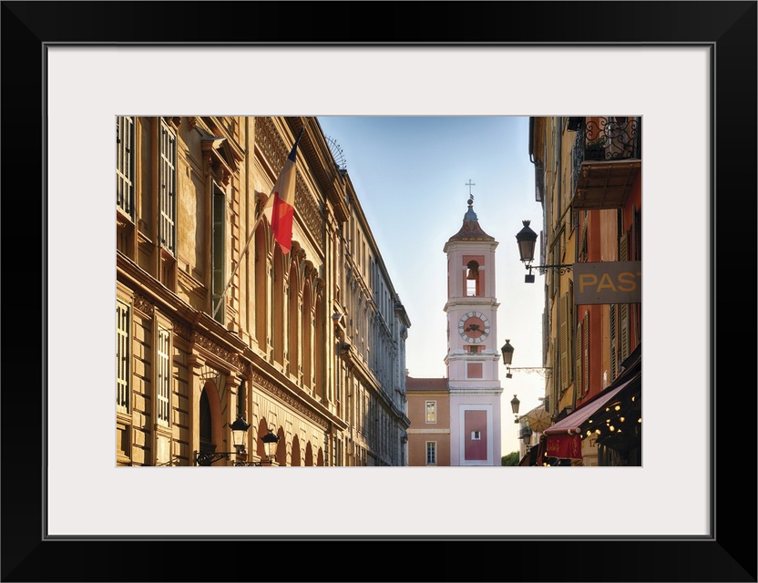 <p>Low angle view of a Clock Tower In Goverment Administrative District, Old Nice, Alpes Maritimes, Cote d'Azur, France</p>