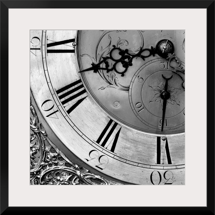 <p>Square black and white photograph of the details of a clock, focusing on the hands and numbers.</p>