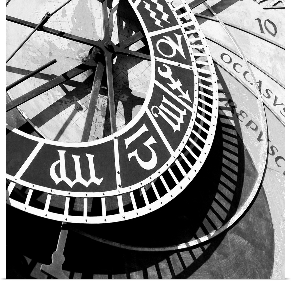 <p>Square black and white photograph of the details of a clock, focusing on the hands and numbers.</p>