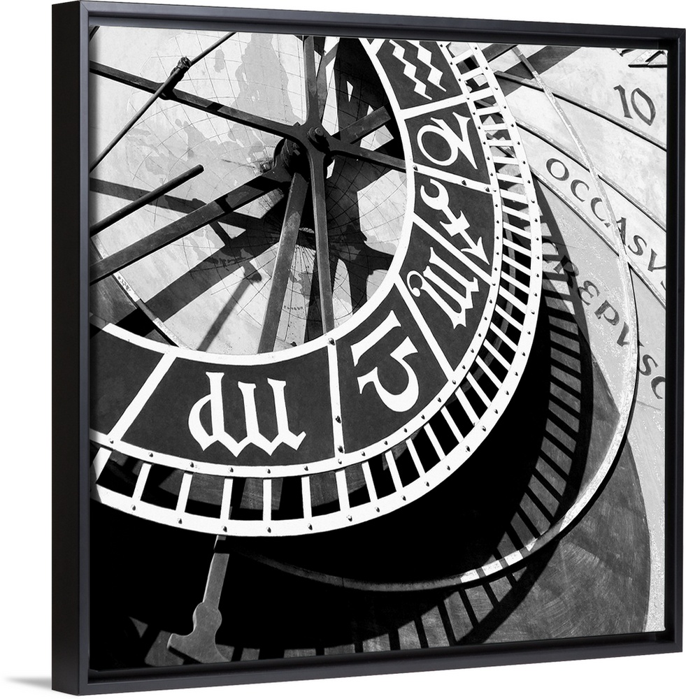 <p>Square black and white photograph of the details of a clock, focusing on the hands and numbers.</p>