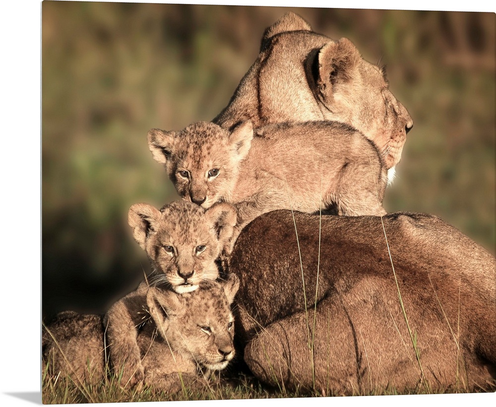 <p>Mother lioness with her three cubs climbing on her back.</p>