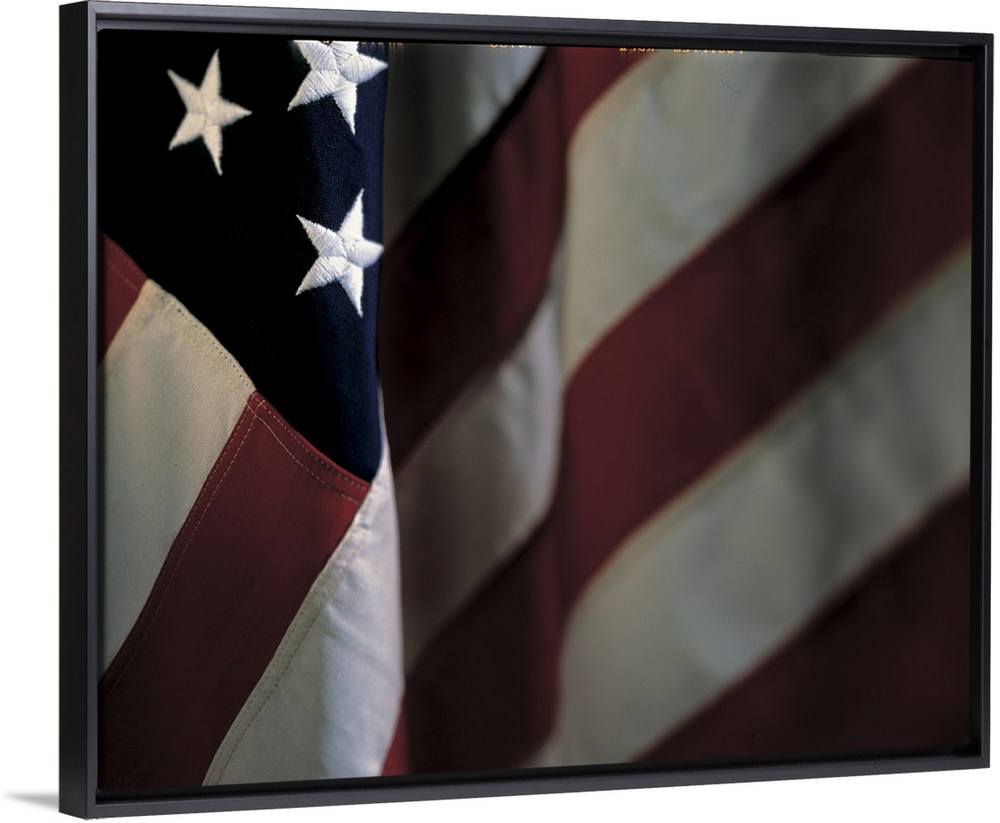 <p>Oversized, close up landscape photograph of part of the stars and stripes of the American flag.</p>