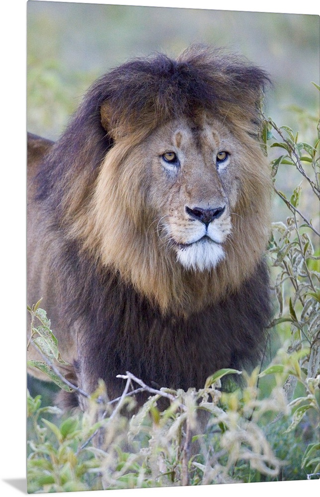 <p>Portrait of an adult male lion standing in the grass, with a big shaggy mane and intense eyes.</p>