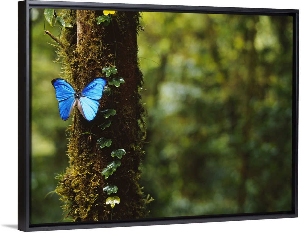 <p>A big photograph of a blue butterfly sitting on a tree trunk with the forest in the background shown out of focus.</p>