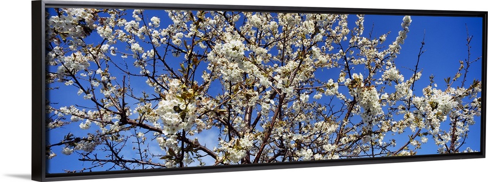 <p>Giant, close up photograph of a fully bloomed cherry blossom tree against a bright blue sky, in Michigan.</p>