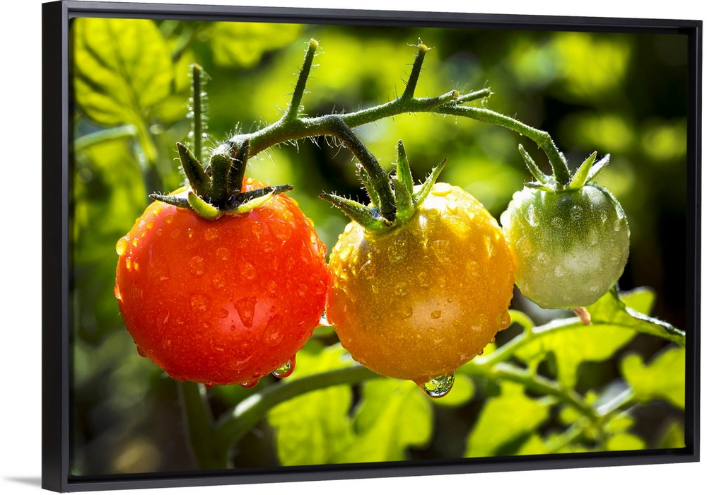 <p>Close-up of a cluster of ripe and unripe cherry tomatoes on a plant in the garden wet with water droplets; Calgary, Alberta, Canada</p>
