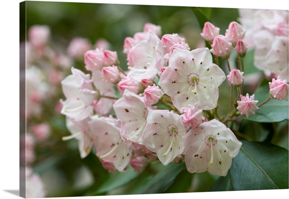 <p>Close up of a flowering branch of a mountain laurel shrub. Framingham, Massachusetts.</p>
