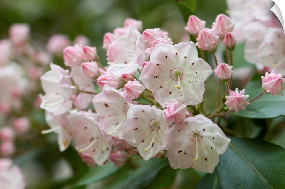 <p>Close up of a flowering branch of a mountain laurel shrub. Framingham, Massachusetts.</p>