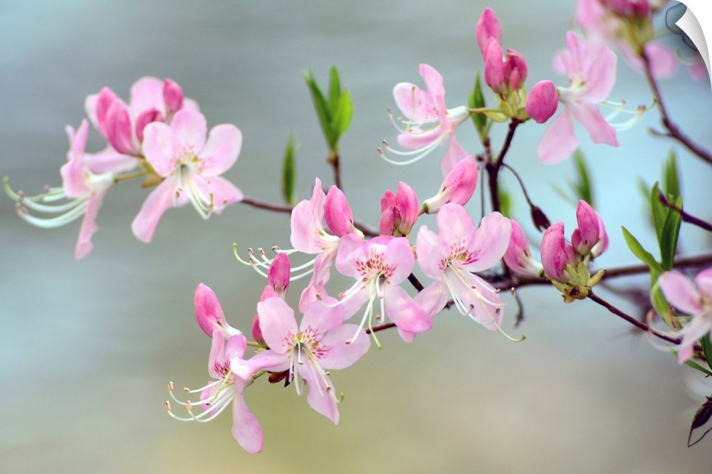 <p>Close up of a flowering branch of a pink azalea shrub, Rhododendron species.</p>
