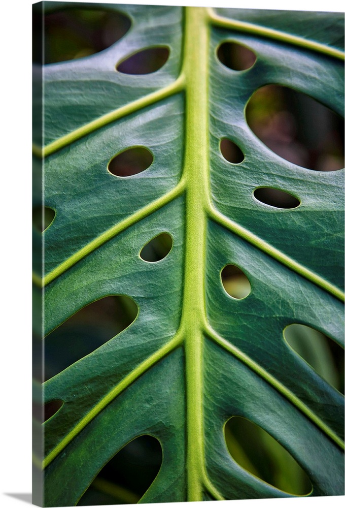 <p>Close up of a green leaf with holes in it; Hawaii, United States of America</p>