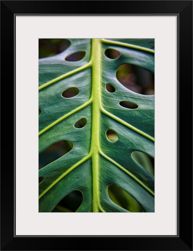 <p>Close up of a green leaf with holes in it; Hawaii, United States of America</p>