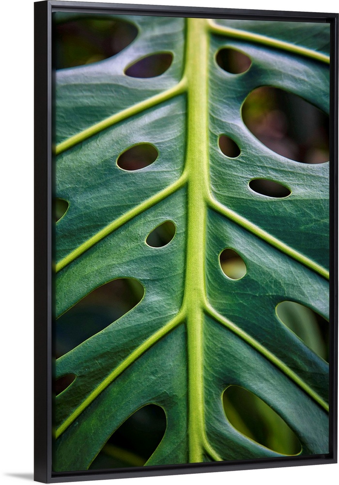 <p>Close up of a green leaf with holes in it; Hawaii, United States of America</p>