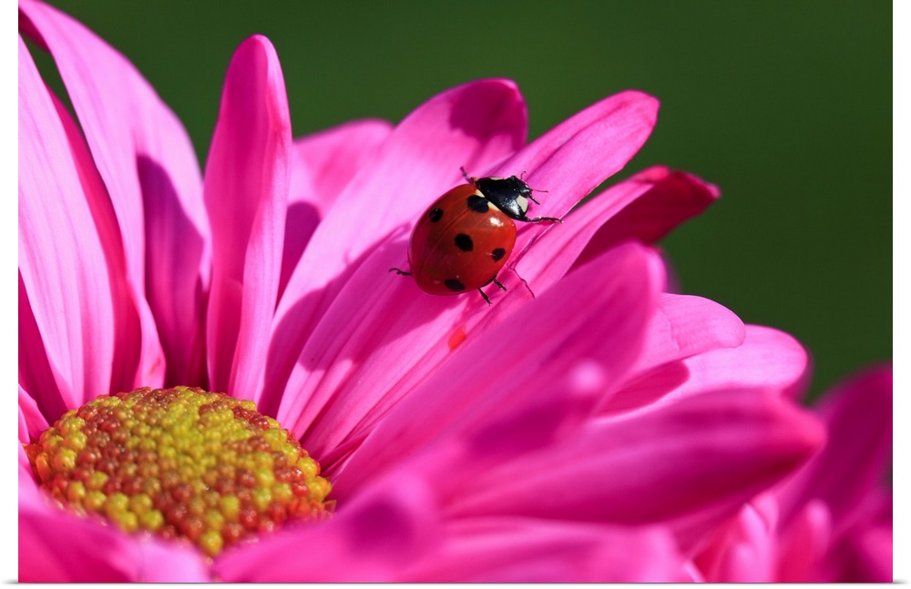 <p>Close-up of a ladybug crawling on a petal of a pink blossom, Oregon, united states of America.</p>
