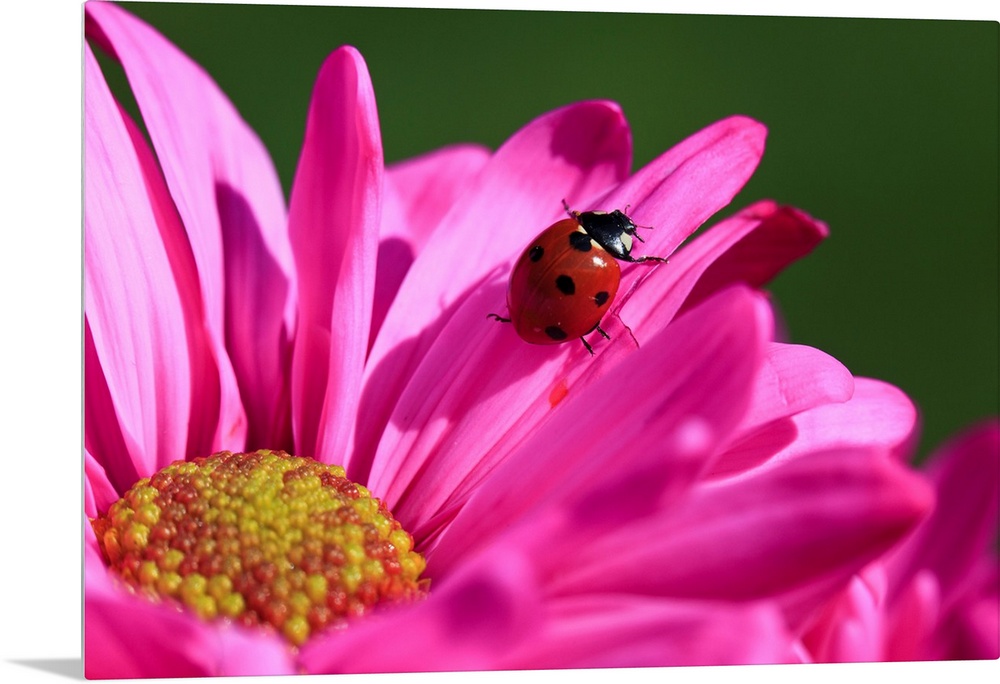 <p>Close-up of a ladybug crawling on a petal of a pink blossom, Oregon, united states of America.</p>