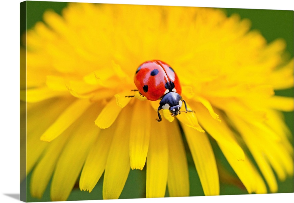 <p>Close-up of a ladybug crawling on a petal of a yellow blossom, Oregon, united states of America.</p>