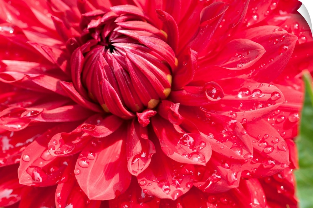 <p>Close up of a large red dahlia flower with water drops.</p>