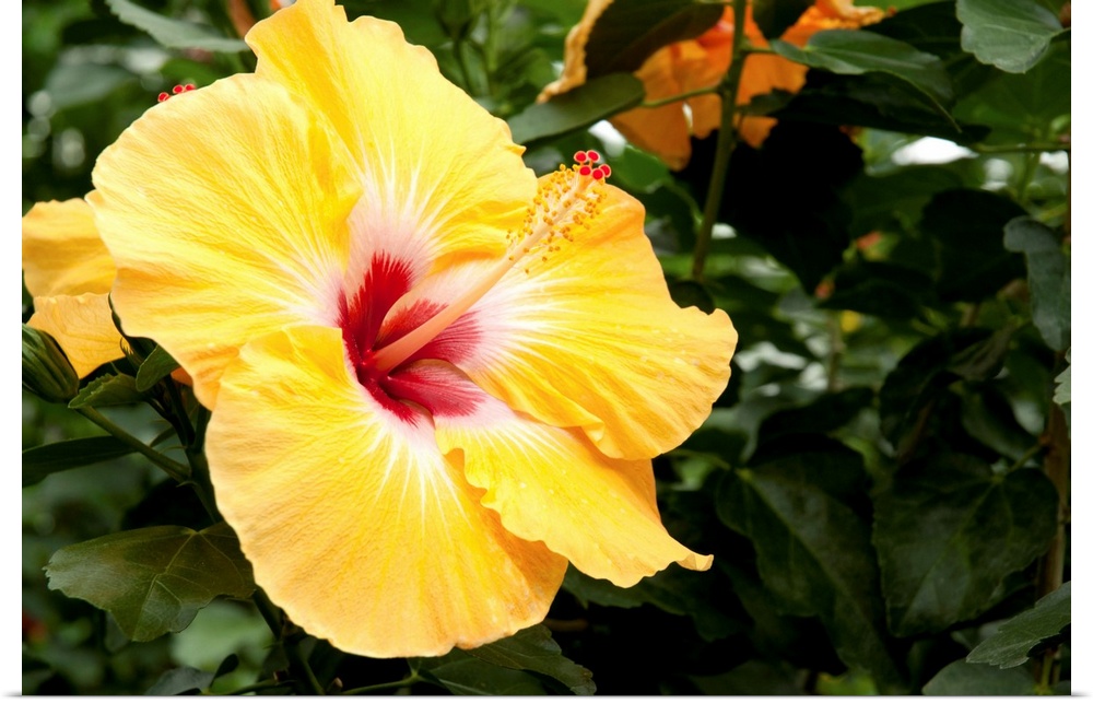 <p>Close up of a large yellow and red hibiscus flower.</p>
