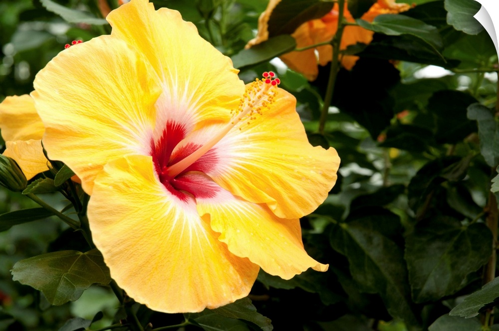 <p>Close up of a large yellow and red hibiscus flower.</p>