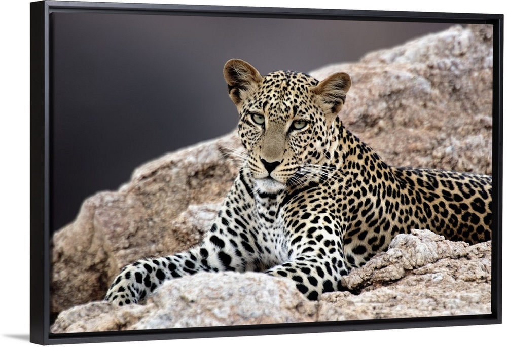 <p>Giant, horizontal photograph of a leopard peering out while lying on rocky terrain.</p>