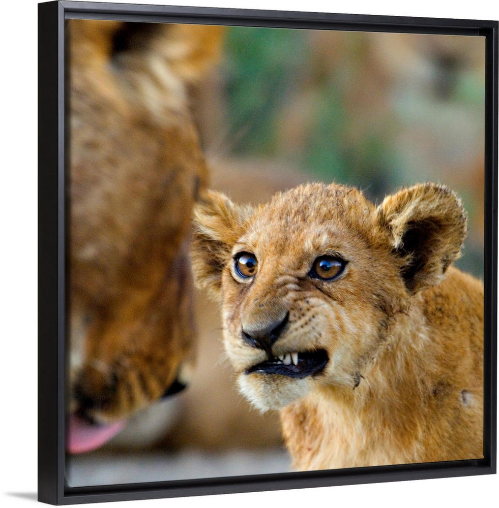 <p>Big photograph shows a young lion as it snarls at a more mature lion. The sharp focus on the young lion is contrasted by the softer focus of the surroundings.</p>