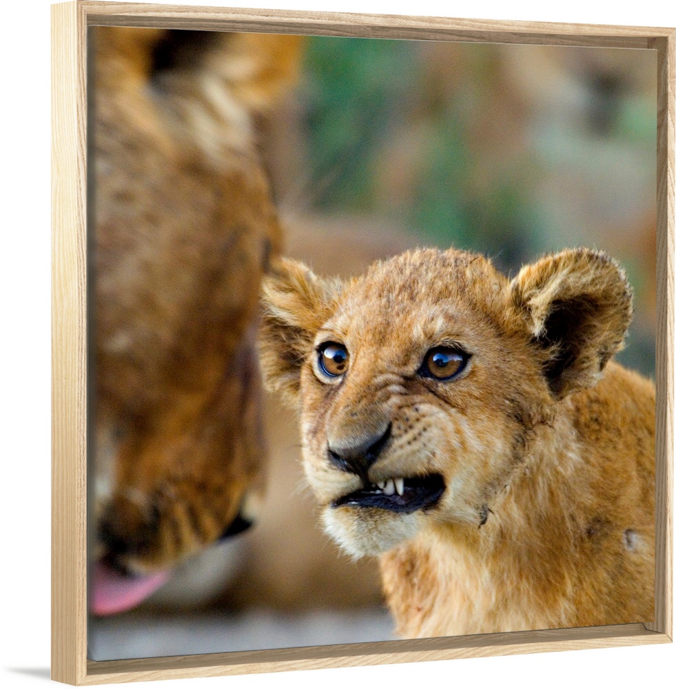 <p>Big photograph shows a young lion as it snarls at a more mature lion. The sharp focus on the young lion is contrasted by the softer focus of the surroundings.</p>