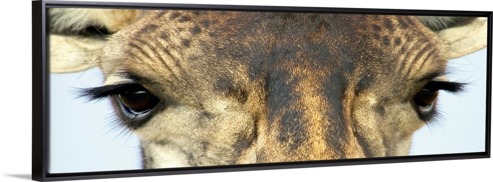 <p>Panoramic wall art that is a close up of an African mammalos face photographed in front of a blank backdrop.</p>
