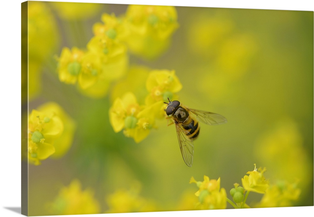 <p>Close-up of a marmalade hoverfly (Episyrphus balteatus) on a cypress spurge (Euphorbia cyparissias) blossom in a meadow in spring, Styria, Austria</p>