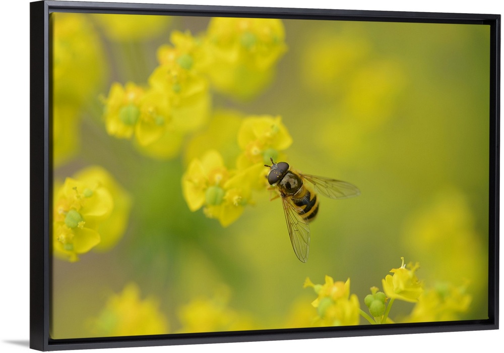 <p>Close-up of a marmalade hoverfly (Episyrphus balteatus) on a cypress spurge (Euphorbia cyparissias) blossom in a meadow in spring, Styria, Austria</p>