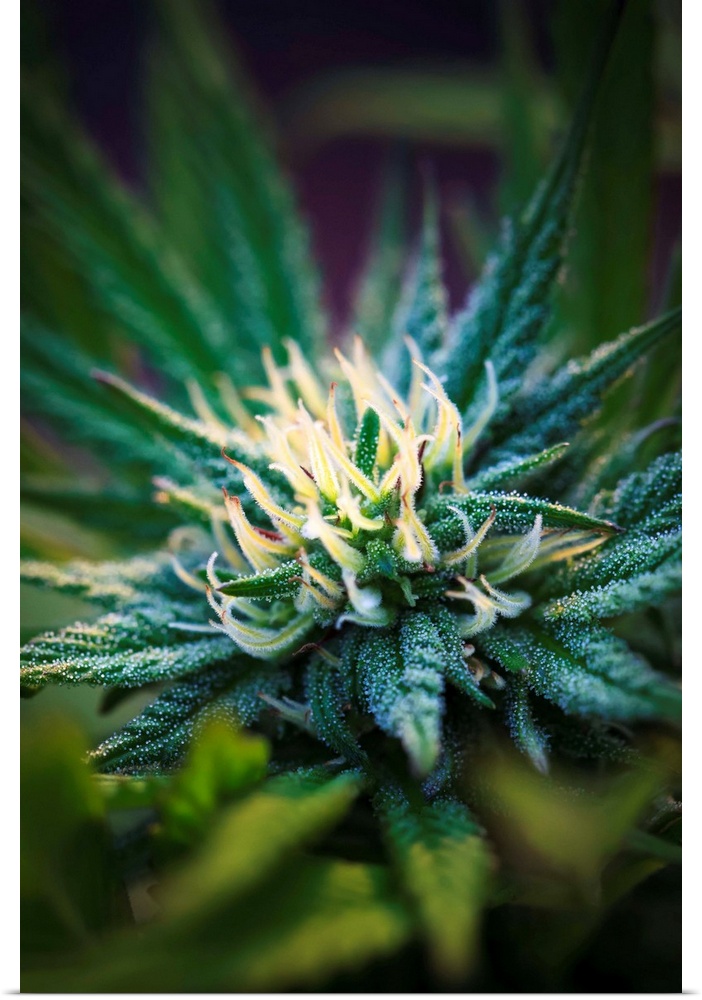 <p>Close-up of a maturing cannabis plant and flower with visible trichomes; Marina, California, United States of America</p>