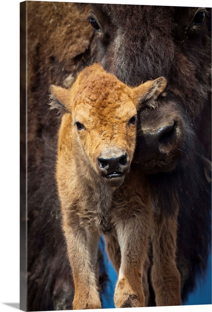 <p>A few-day-old Wood bison calf looks at camera while its protective mother snuggles against it. Captive. AWCC. Southcentral Alaska. Summer.</p>