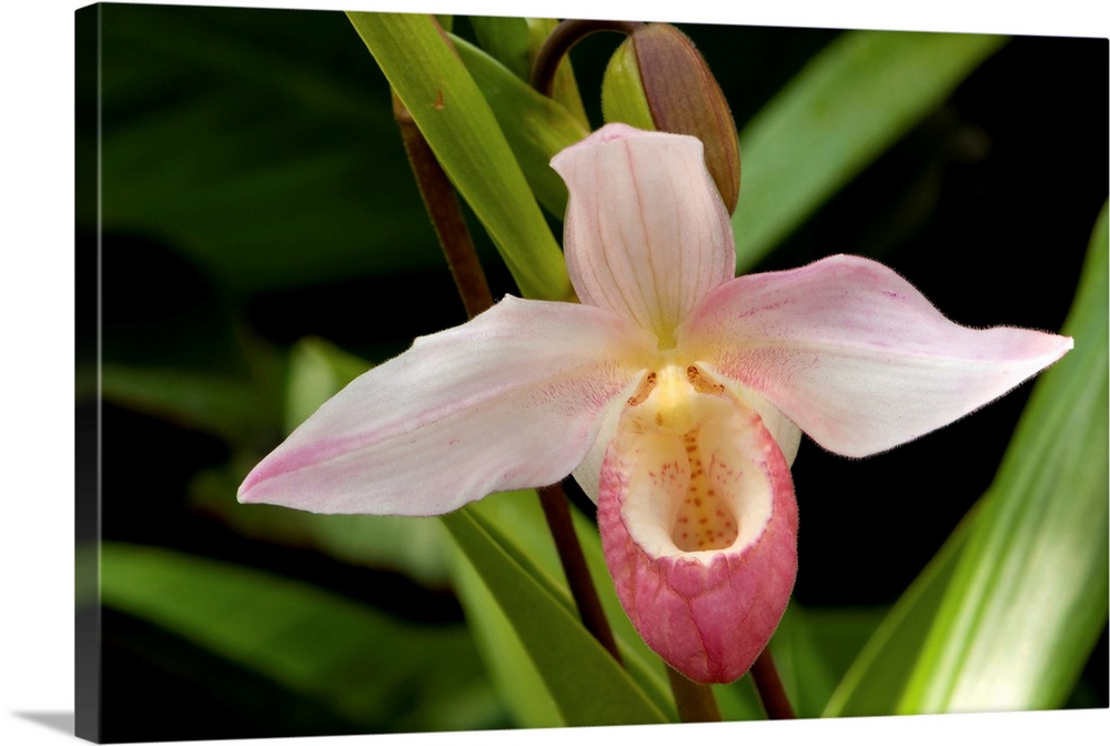 <p>Close up of a pink lady's slipper orchid flower, Cypripedium species.</p>