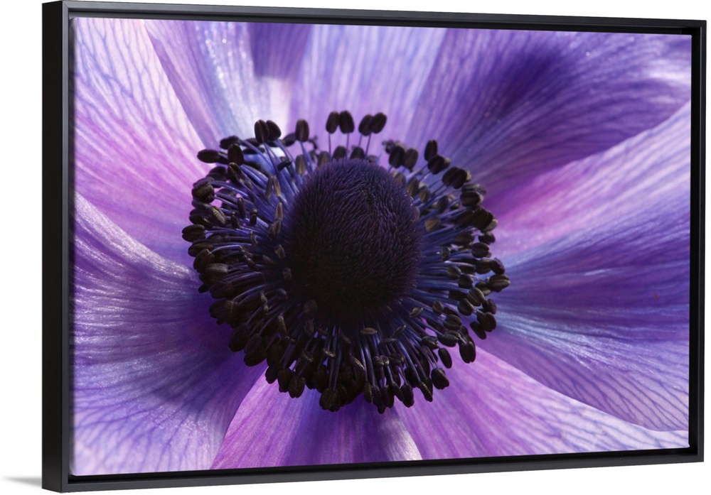 <p>Close up of a purple anemone flower, Anemone coronari. Arlington, Massachusetts.</p>