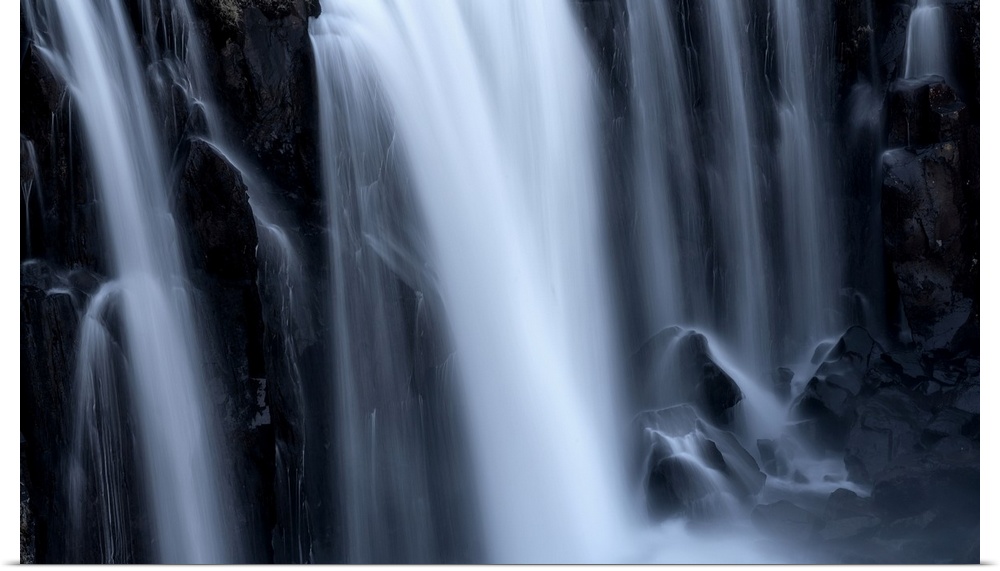 <p>Close-up of a series of waterfalls, the soft blur of flowing water over black rock, Iceland.</p>