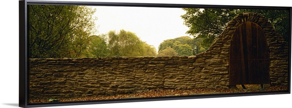 <p>An arched wooden door sits in the middle of a timeworn stone wall in the quiet Irish countryside.</p>