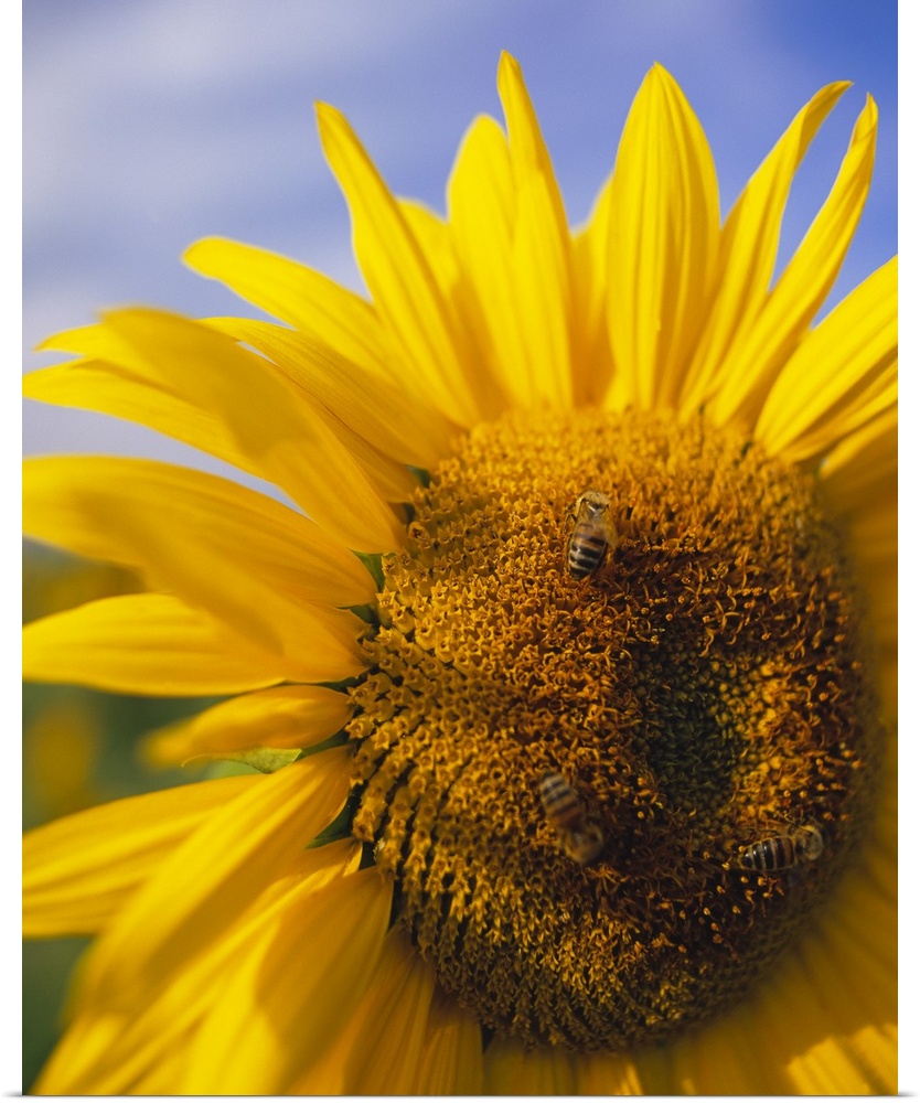 <p>Canvas photo art of the up-close of a sunflower with a bubble bee sitting on top of the head.</p>