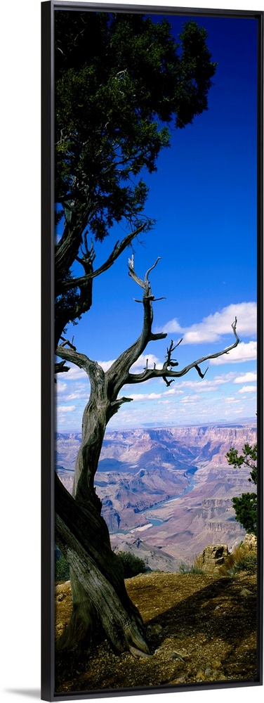 <p>Huge vertical photograph involving a close-up of a tree in Grand Canyon National Park, Arizona (AZ) with vast peaks and valleys in the background. The lush growth in the foreground is contrasted with the vast emptiness of the canyons and bright, sunny sky in the background.</p>