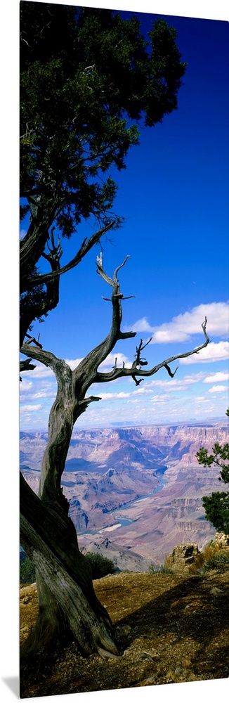 <p>Huge vertical photograph involving a close-up of a tree in Grand Canyon National Park, Arizona (AZ) with vast peaks and valleys in the background. The lush growth in the foreground is contrasted with the vast emptiness of the canyons and bright, sunny sky in the background.</p>