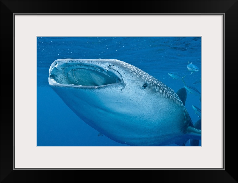 <p>Close-up of a whale shark swimming with mouth open wide, Maldives.</p>