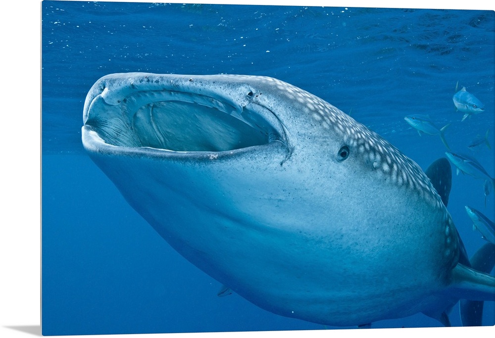 <p>Close-up of a whale shark swimming with mouth open wide, Maldives.</p>