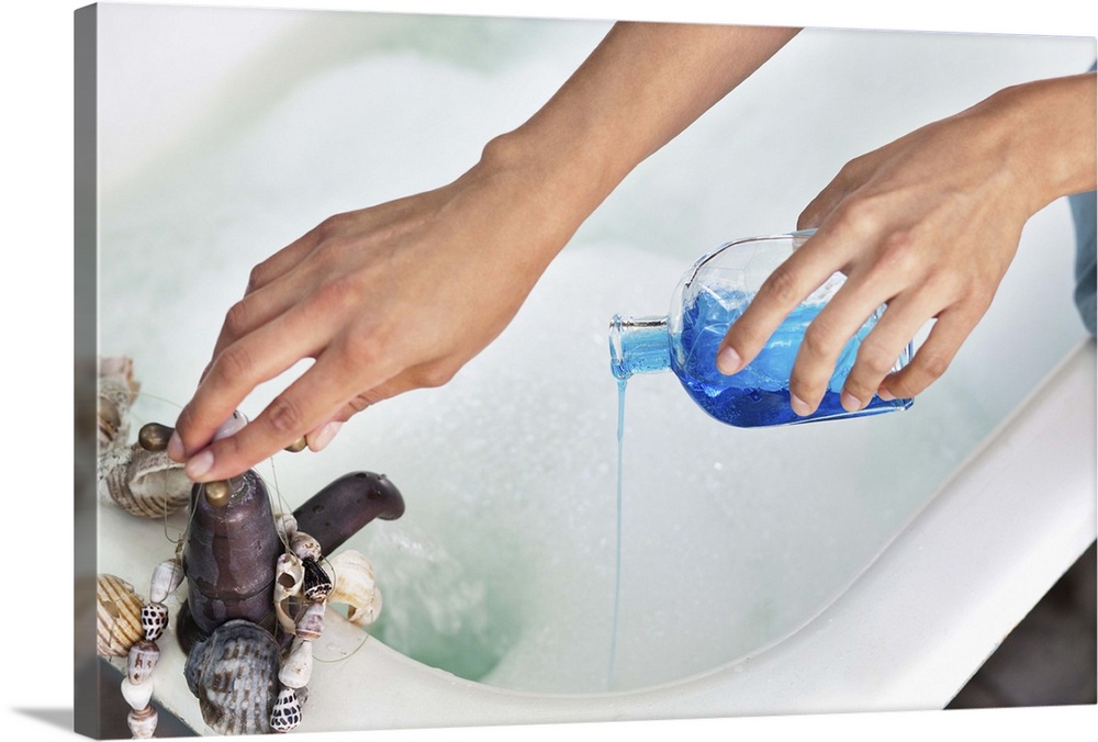 Close-up of a woman's hand pouring aromatherapy oil in a bathtub