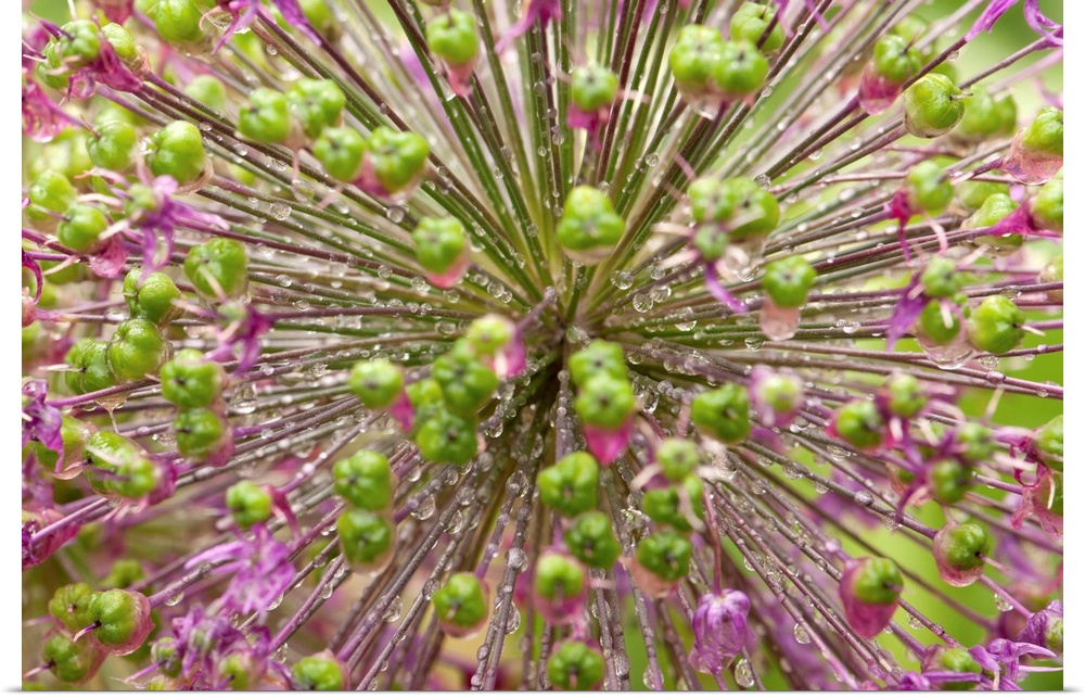 <p>Close up of an allium plant, flowers, buds, and water drops.</p>