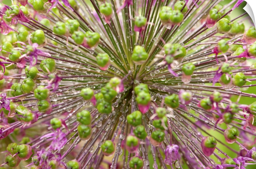 <p>Close up of an allium plant, flowers, buds, and water drops.</p>